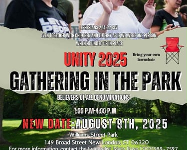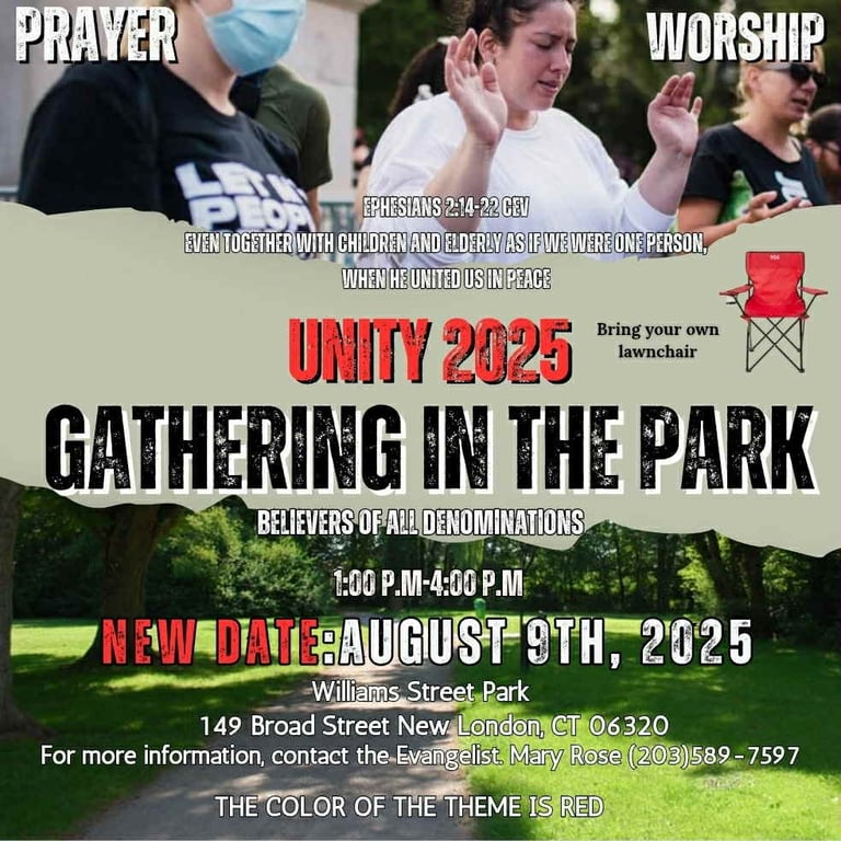The Unity Gathering in the Park is part of Evangelist Mary Harris Rose’s vision to bring believers of all denominations together in prayer, worship, and community healing. This outreach creates a space where people can seek God, receive encouragement, and experience His peace in an open, welcoming environment. Through collaboration with churches across Connecticut, Mary works to restore unity in the Body of Christ, break down barriers, and create real moments of revival. These gatherings reflect her heart for outreach, reconciliation, and strengthening communities through the power of prayer and the presence of God.