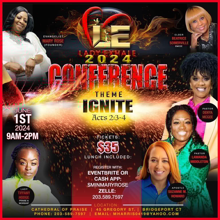 The Lady Exhale Annual Women’s Conference is one of the most impactful gatherings in Connecticut, founded and led by Evangelist Mary Harris Rose. Each year, up to 300 women come together for a life-changing experience filled with healing, deliverance, worship, biblical teaching, and spiritual renewal. Women travel from across the state, and even from out of state, to encounter God and receive breakthrough.